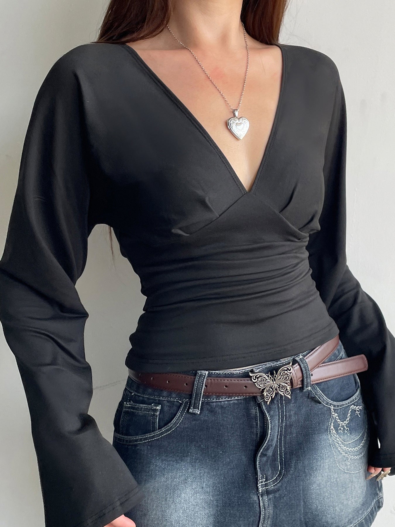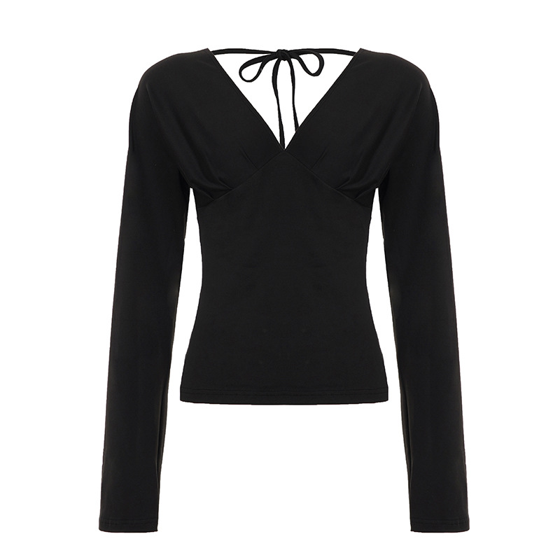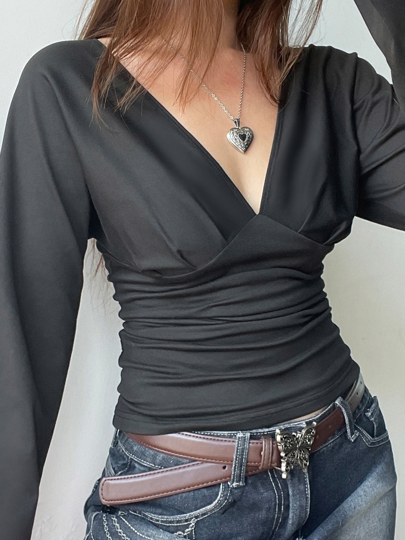 New Fashion Waist V-Neck Pinch Pure Color Long-Sleeved Top Slimming Sexy Hottie T-Shirt HZ0108