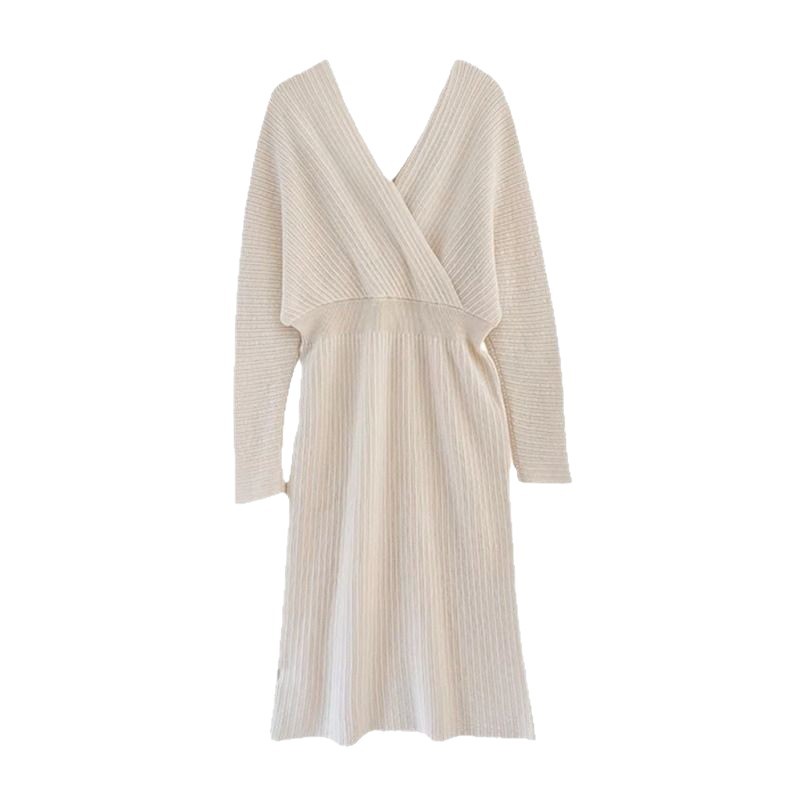 The Waist Display Thin Cross-Collar Knitted Dress Women 2025 Autumn And Winter With Coat V-Neck Long Bottom Sweater Dress HZ0108